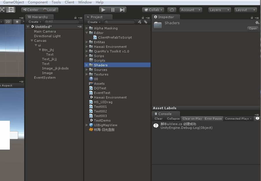 使用的时候要记得在Hierarchy 视窗中选中 Prefab 的最外层节点,然后点击 菜单栏的 Client/自动生成客户端UI代码 然后在 Console中显示“脚本创建成功” 就说明脚本自动生成 成功了。